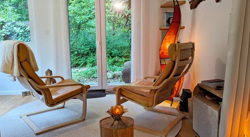 Der Praxisraum liegt ruhig am Waldrand von Bad Belzig – ein geschützter Ort für intensive psychotherapeutische Prozesse.